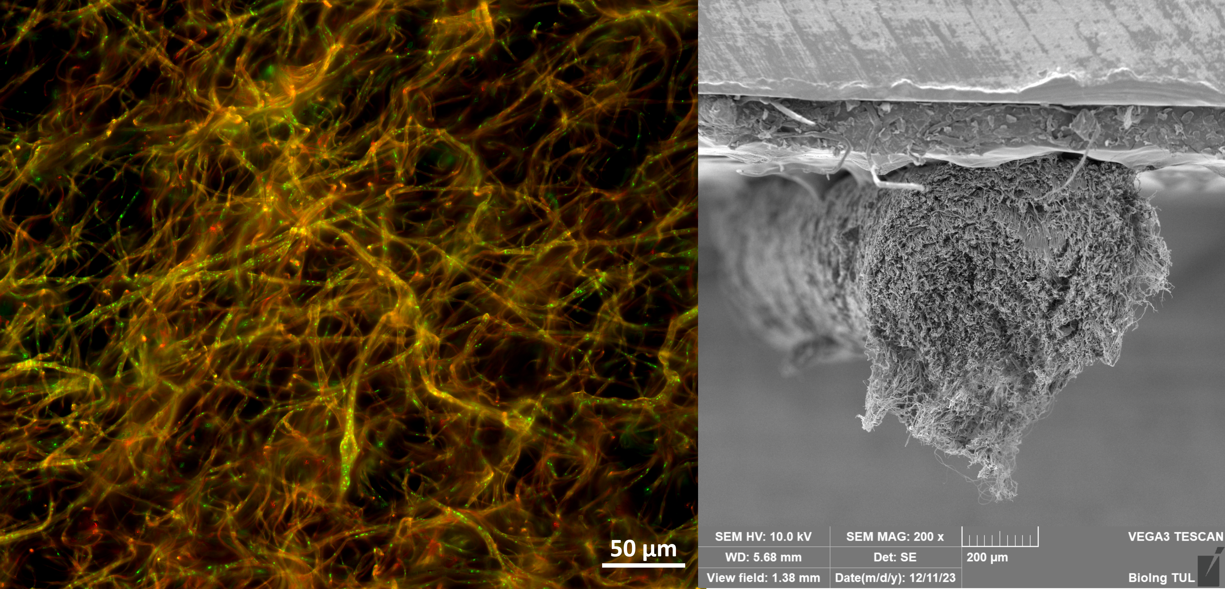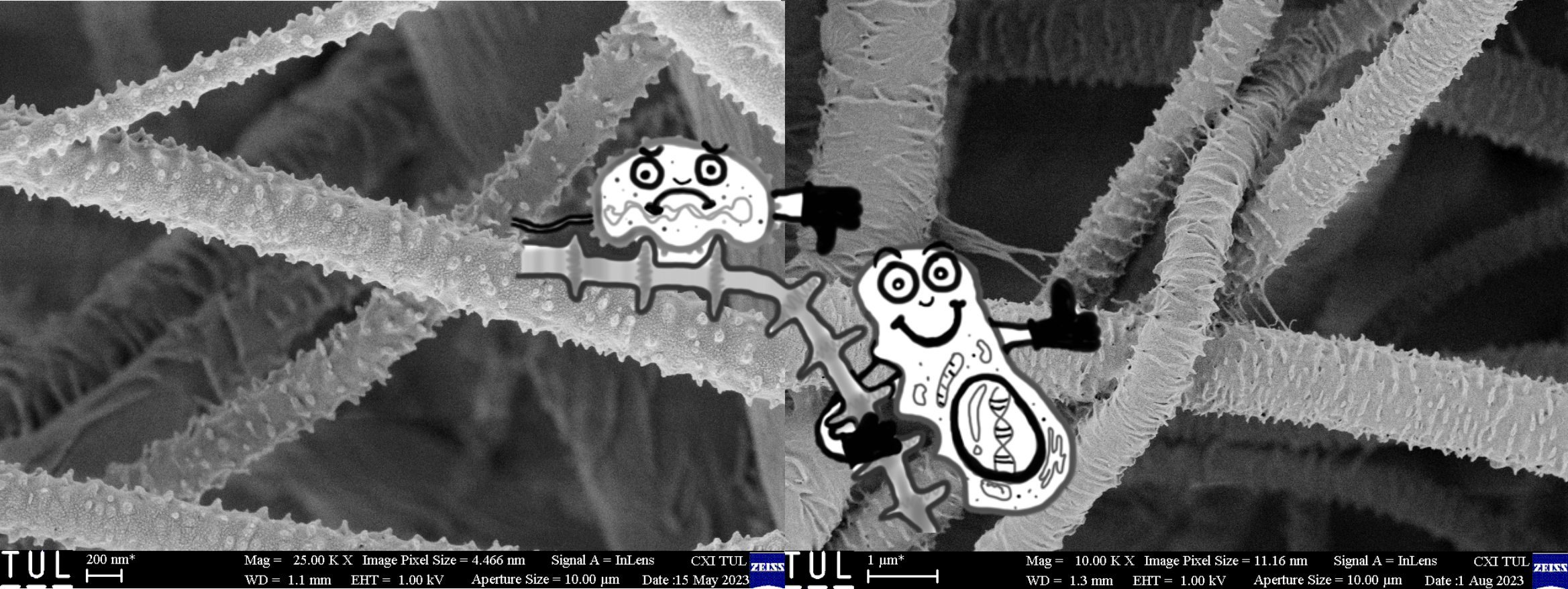 Mikrobiální infekce komplikují úspěšnou léčbu mnoha zranění. Proto jsou hledány nové technologie usnadňující hojení, snižující mikrobiální rizika a zároveň nezvyšující rizika vzniku antimikrobiální rezistence. Předkládaný projekt si klade za cíl vyvinout nanovlákenné materiály se strukturou shish-kebab (NFSK) napodobující baktericidní struktury vyskytující se na křídlech hmyzu. Možnost cíleného ovlivnění interakcí prokaryotických i eukaryotických buněk s NFSK pomocí úprav morfologie a struktury bude studována v průběhu projektu. Ideální NFSK by měl být biokompatibilní a inhibovat růst nežádoucích mikroorganismů bez nutnosti funkcionalizace. V rámci projektu budou analyzovány mikrobiální interakce s NFSK ve formě jednotlivých vláken i vrstev, konkrétně adheze, tvorba biofilmu, odpověď na oxidativní stres a degradace. Dále bude ověřena biokompatibilita. Navržený soubor cílů dosud nebyl studován, výstupy projektu proto mohou značně usnadnit vývoj nové generace biomateriálů. Cílem projektu je výroba materiálů se strukturou shish-kebab (NFSK), charakterizace jejich fyzikálně-chemických a morfologických vlastností a vlivu na tvorbu biofilmu, viabilitu mikrobiální populace a její oxidativní odpověď a zároveň biokompatibilitu z hlediska interakce s eukaryotickými buňkami.