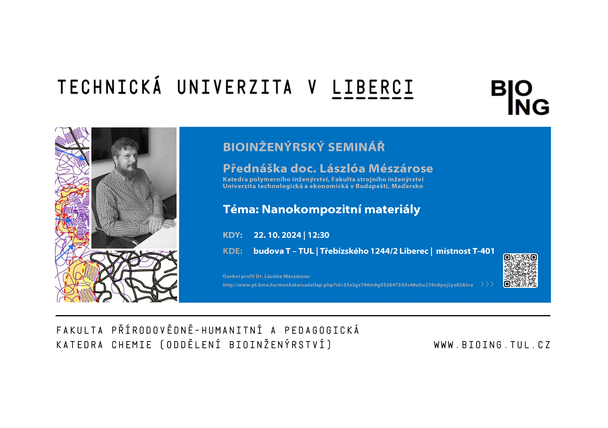 Oddělení Bioinženýrství katedry chemie zve všechny zájemce na přednášku docenta Lászlóa Mészárose na téma Nanokompozitní materiály, která se uskuteční 22. října 2024 ve 12:30 v budově T.
