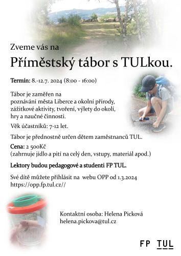 Přihlaste své děti na náš příměstský tábor, postarají se o ně vyučující i studentky a studenti FP TUL. V ceně 2500 Kč je zahrnuto jídlo a pití na celý den, materiál pro tvoření, vstupy atd.