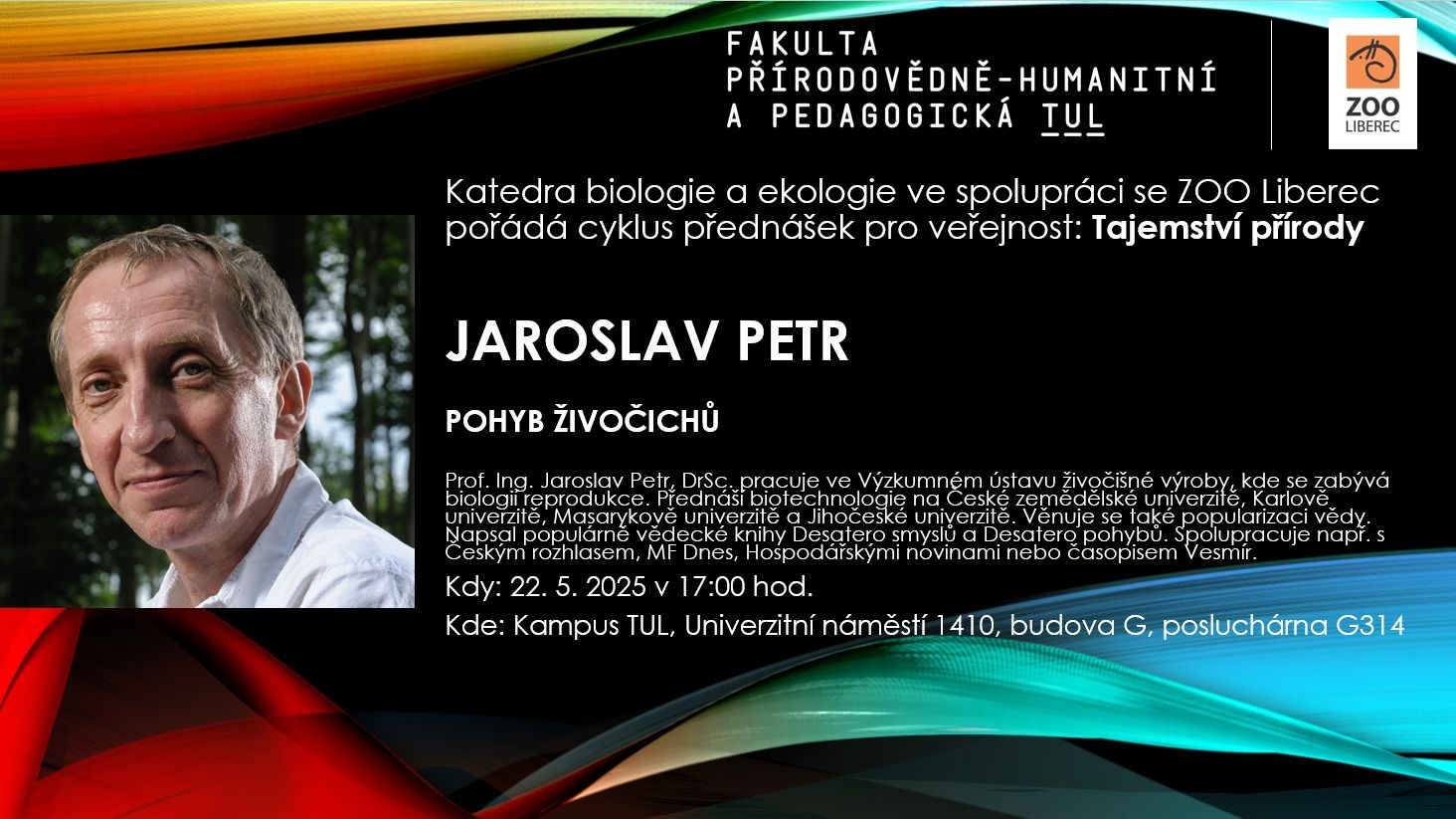 A ve spolupráci se ZOO Liberec se uskuteční poslední přednášku z cyklu Tajemství přírody v tomto akademickém roce, na kterou KBE srdečně zve všechny zájemce. Přednáška Prof. Ing. Jaroslava Petra z Výzkumného ústavu živočišné výroby na téma Pohyb živočichů a vše, co s tím souvisí se uskuteční v 17 hodin (budova G, posluchárna G314).