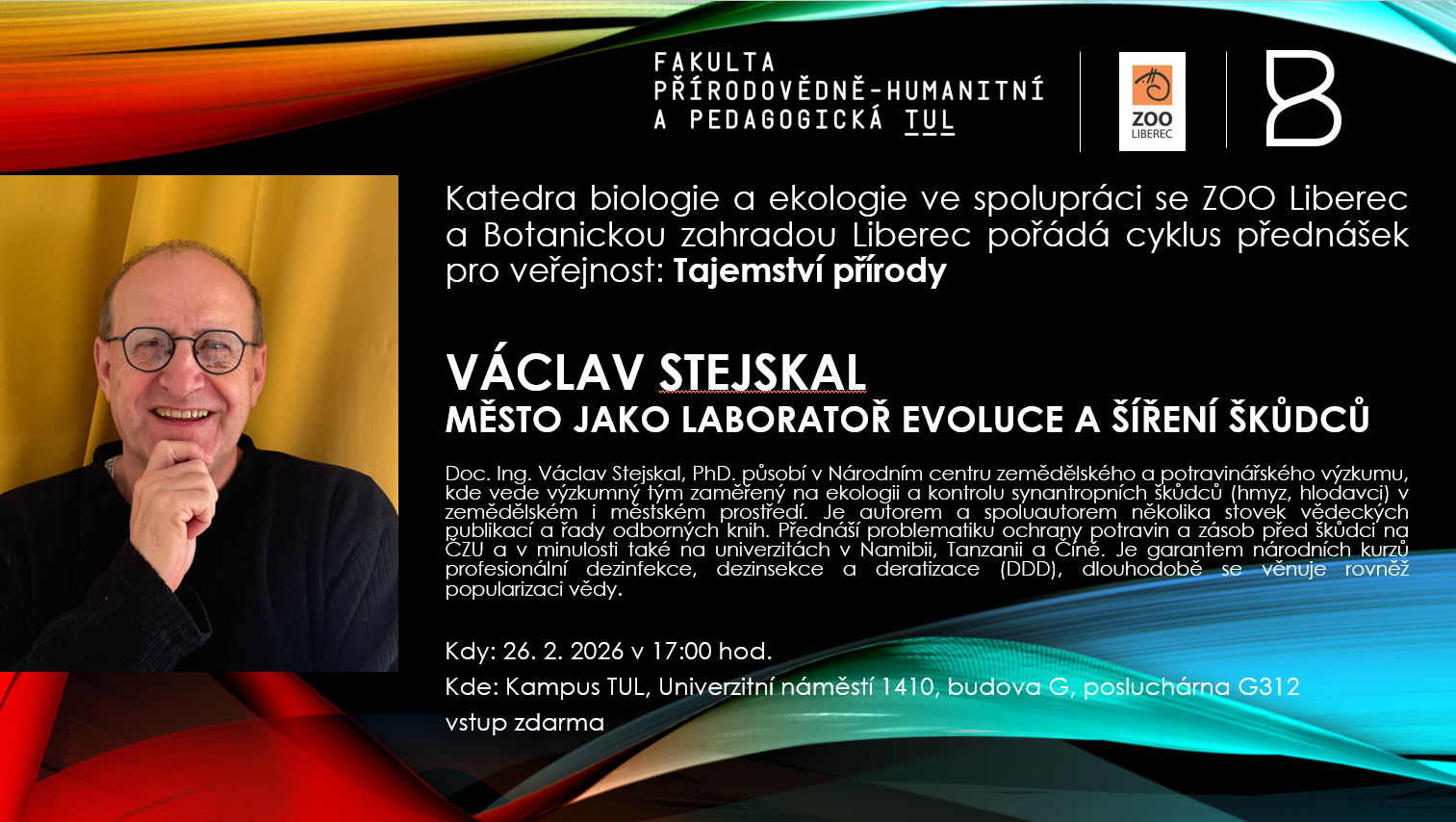 Katedra biologie a ekologie (KBE) zve všechny zájemce na přednášku vědce Václava Stejskala Město jako laboratoř evoluce a šíření škůdců, která se uskuteční ve čtvrtek 26. února 2026 v 17 hodin v budově G (G312).