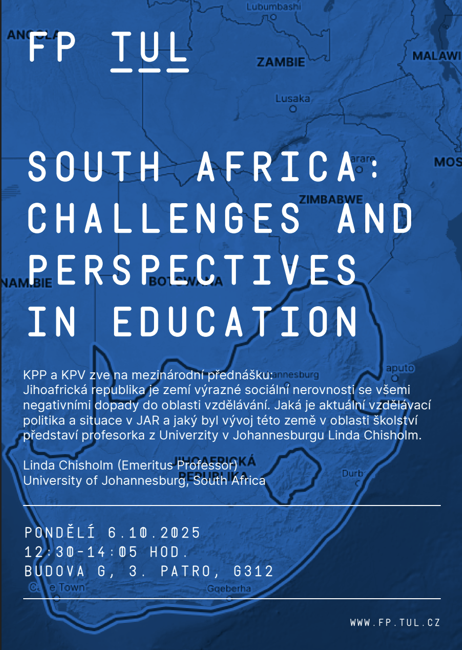 Katedra pedagogiky a psychologie (KPP) a katedra primární a preprimární pedagogiky (KPV) zvou všechny zájemce na mezinárodní přednášku South Africa: Challenges and Perspectives in Education, která se uskuteční v pondělí 6. října 2025 ve 12:30 na budově G (učebna G-312).