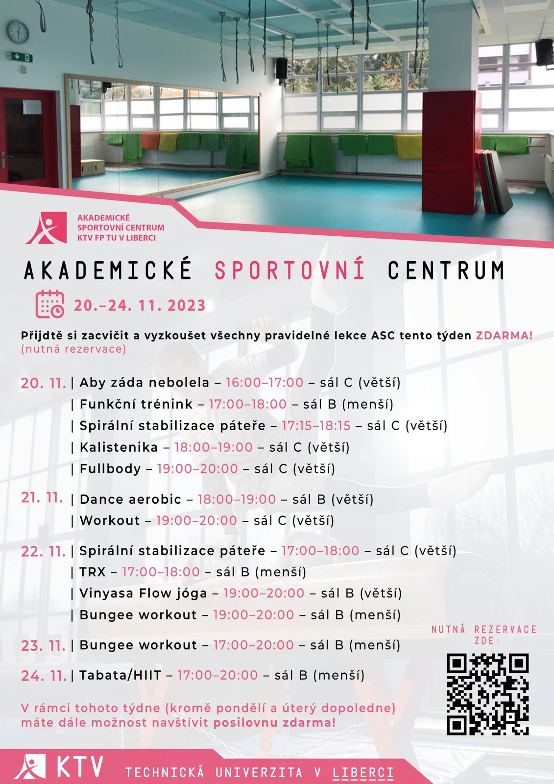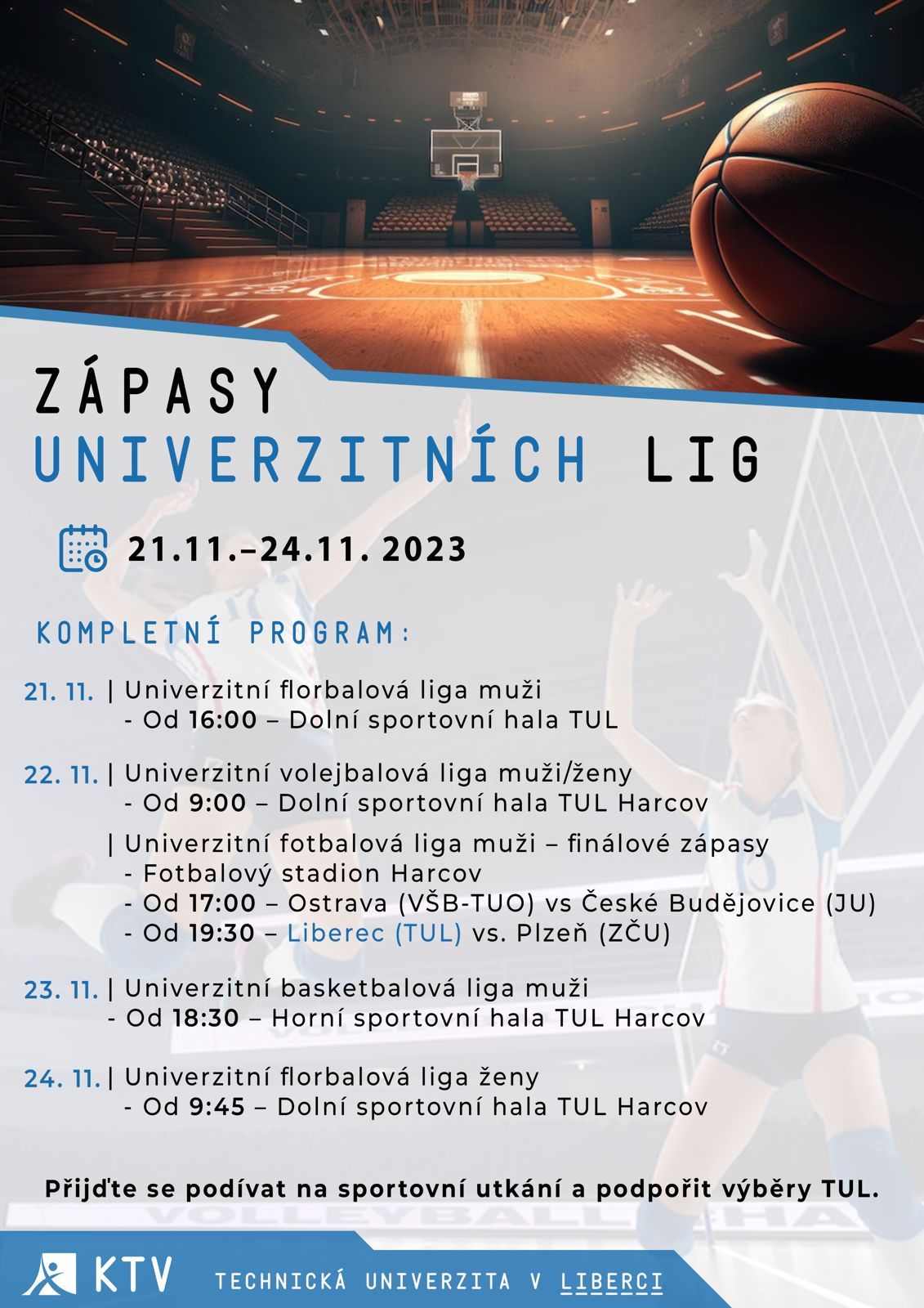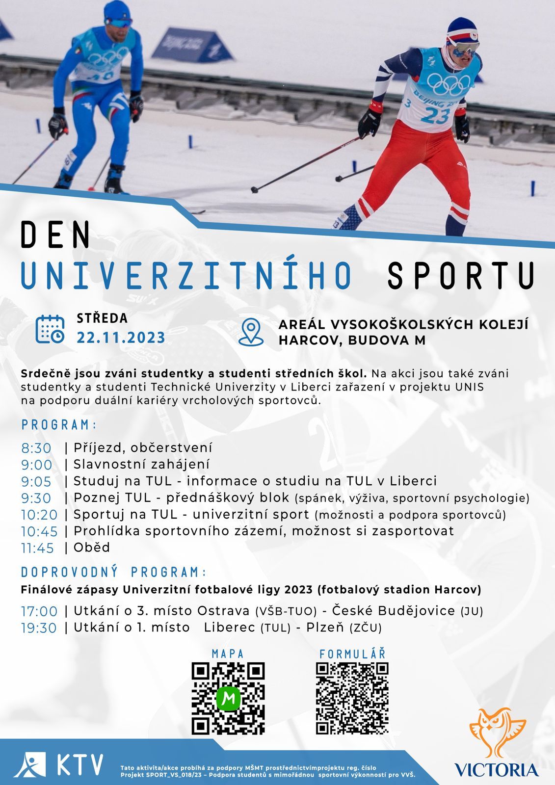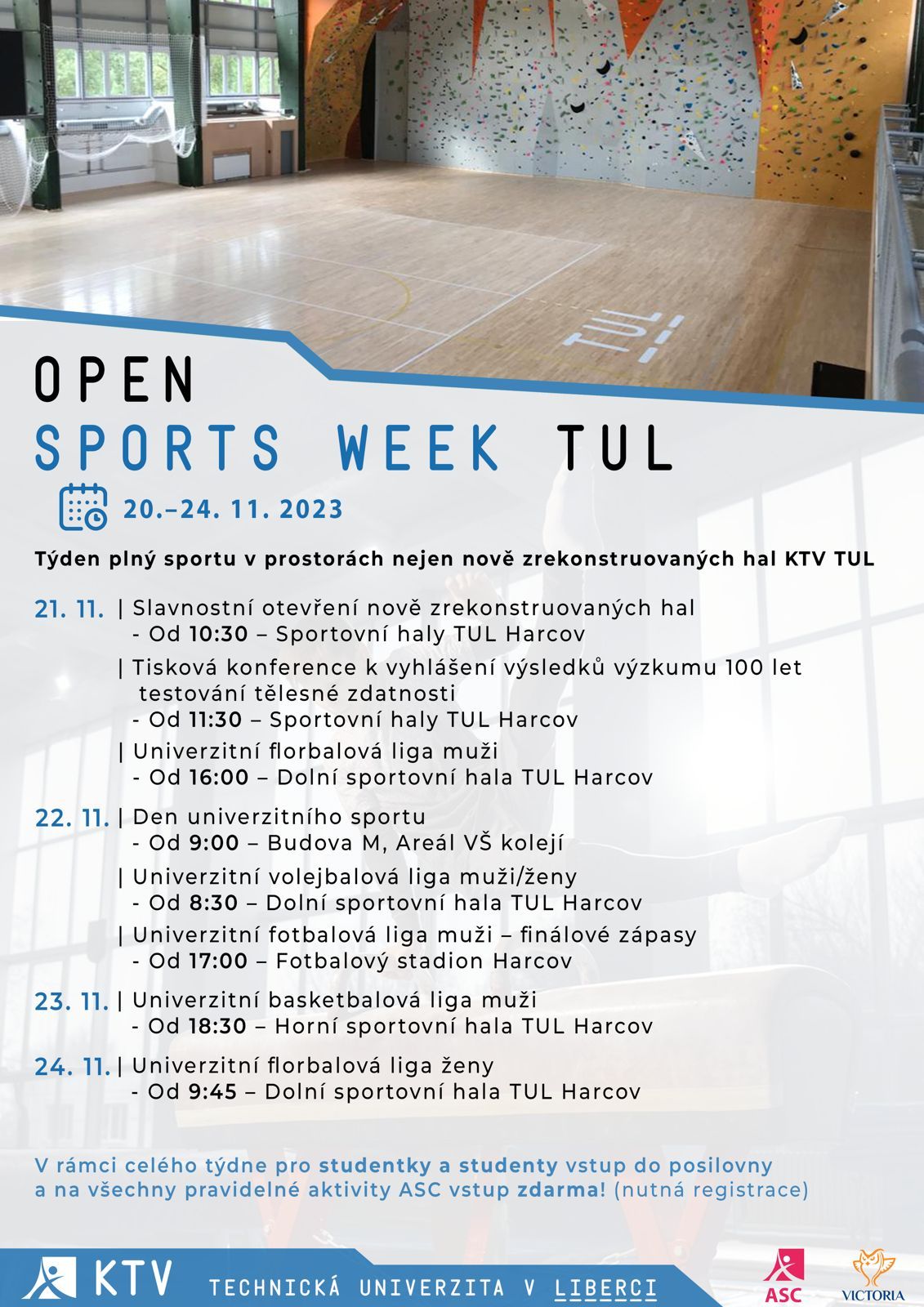 Po náročné rekonstrukci se tento týden slavnostně otevřou prostory Katedry tělesné výchovy a sportu. Máme před sebou dny nabité sportovními i jinými akcemi - Open sports week TUL. Cvičit můžete začít již v pondělí 20.11. v 16.00 v rámci série tréninků. Stežejní událostí pro fakultu bude úterní slavnostní otevření v 10.30 a tisková konference k vyhlášení výsledků výzkumu 100 let testování tělesné zdatnosti. Ve středu dopoledne následuje Den univerzitního sportu pro studentky a studenty střeních škol a odpoledne finálové zápasy Univerzitní fotbalové ligy 2023. Další ligové zápasy proběhnou ve florbalu, volejbalu a basketbalu.