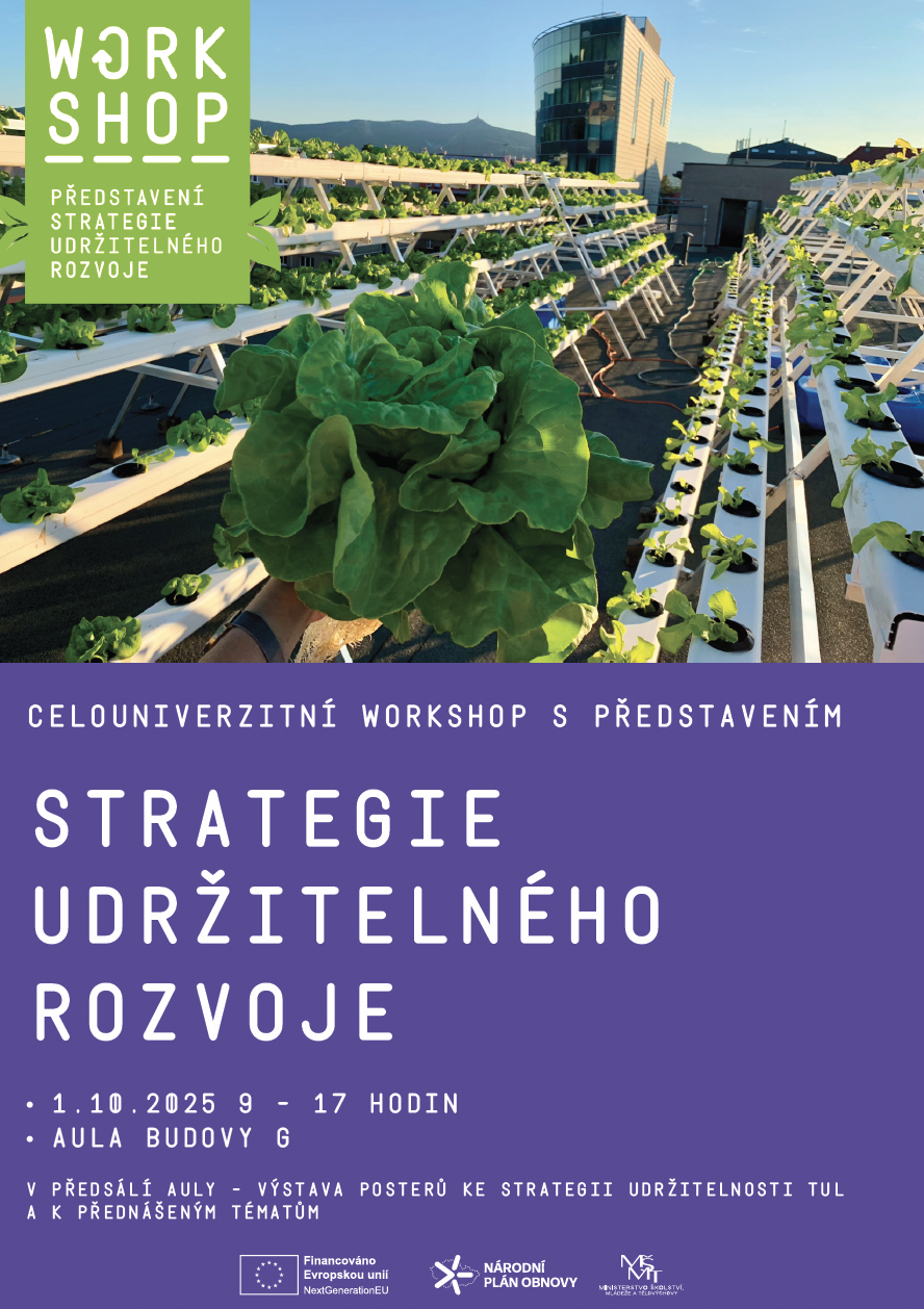 Technická univerzita v Liberci zve všechny zájemce z řad vyučujících, studujících i široké veřejnosti na celouniverzitní workshop Strategie udržitelného rovoje, který se koná 1. října 2025 od 9 do 17 hodin v aule budovy G.