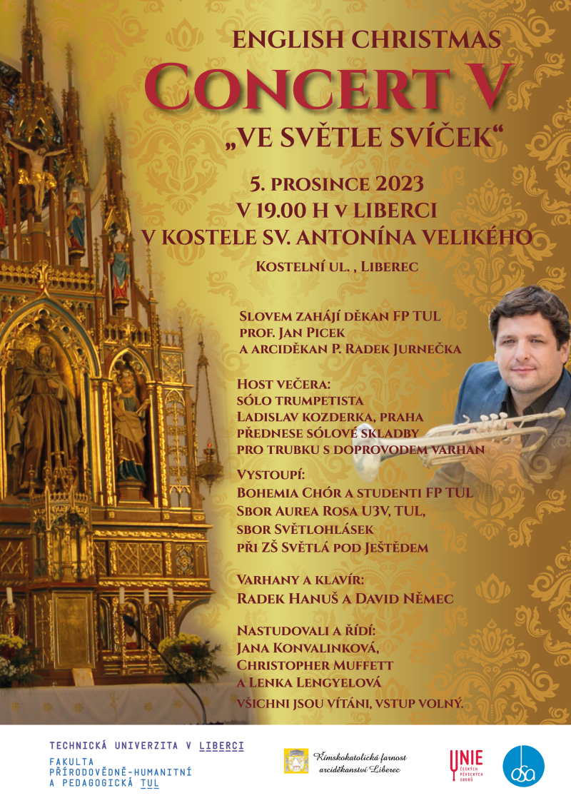 Technická univerzita v Liberci již po páté pořádá 5. prosince 2023 od 19h v kostele sv. Antonína Velikého v Liberci adventní koncert s názvem English Christmas Concert – „Ve světle svíček“. Pro letošní provedení přizvala vzácného hosta, sólo trumpetistu Ladislava Kozderku z Prahy.