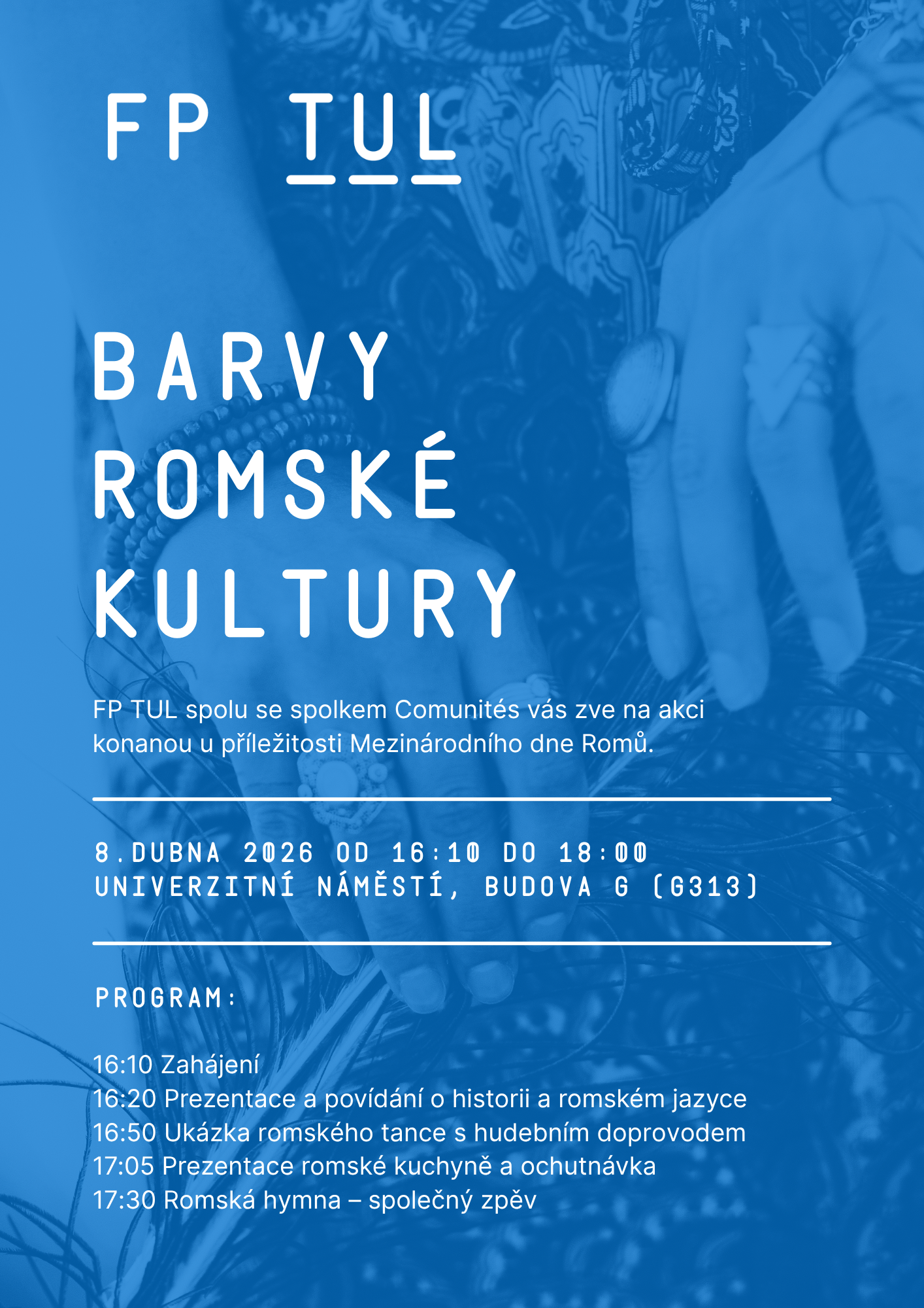 Zveme všechny zájemce na akci Barvy romské kultury konanou u příležitosti Mezinárodního dne Romů ve středu 8. dubna 2026 od 16:10 na budově G (místnost G313). Těšit se mimo jiné můžete na povídání o romské historii a jazyce, ukázku romského tance s hudebním doprovodem, ochutnávku romské kuchyně.