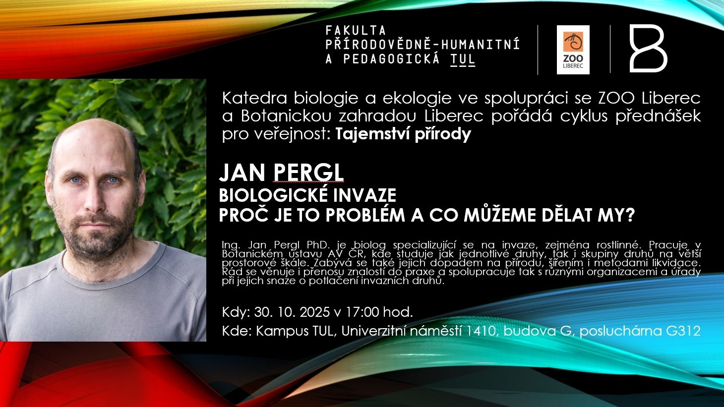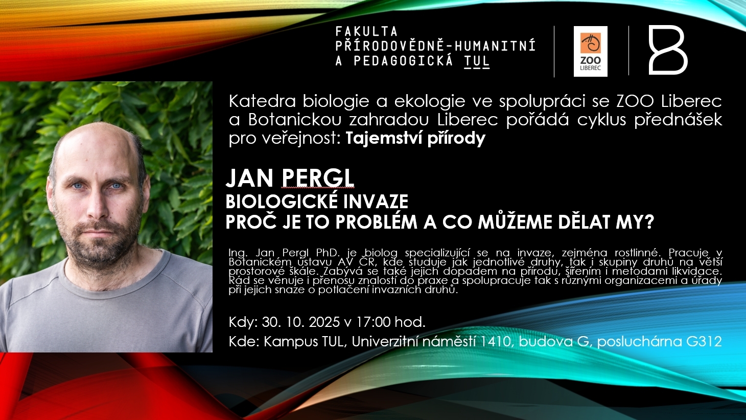 Katedra biologie a ekologie (KBE) s novým semestrem pokračuje ve svém přednáškovém cyklu pro veřejnost Tajemství přírody, který pořádá spolu se ZOO Liberec a Botanickou zahradou Liberec. Přijďte ve čtvrtek 30. října 2025 v 17 hodin (posluchárna G312, budova G, Univerzitní náměstí) na zajímavou přednášku Biologické invaze – Proč je to problém a co s tím můžeme dělat s Janem Perglem, specialistou na invazivní rostliny.