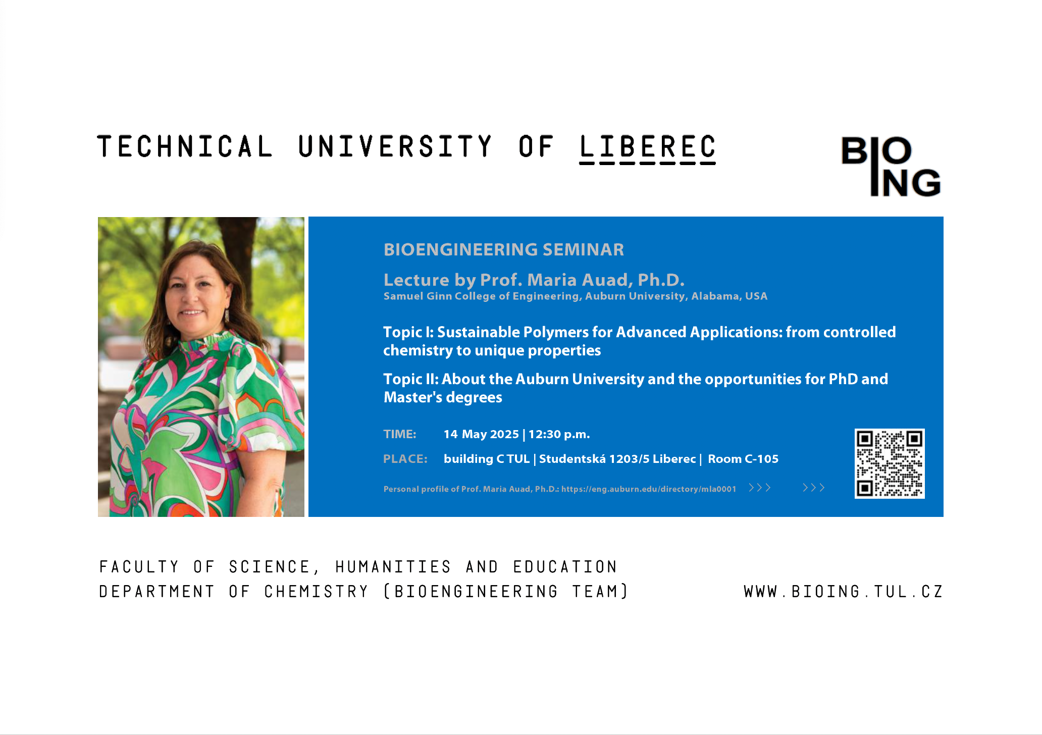 Přednáška se bude věnovat polymerní chemii a nese název Sustainable Polymers for Advanced Applications: From Controlled Chemistry to Unique Properties. Součástí přednášky bude také detailnější představení Auburn University a možností zdejšího magisterského a doktorského studia, neboť paní profesorka Auad zastává také pozici proděkanky pro postgraduální studium a rozvoj fakulty Samul Ginn College of Engineering. Všichni kolegové a zejména studující jsou srdečně zváni.