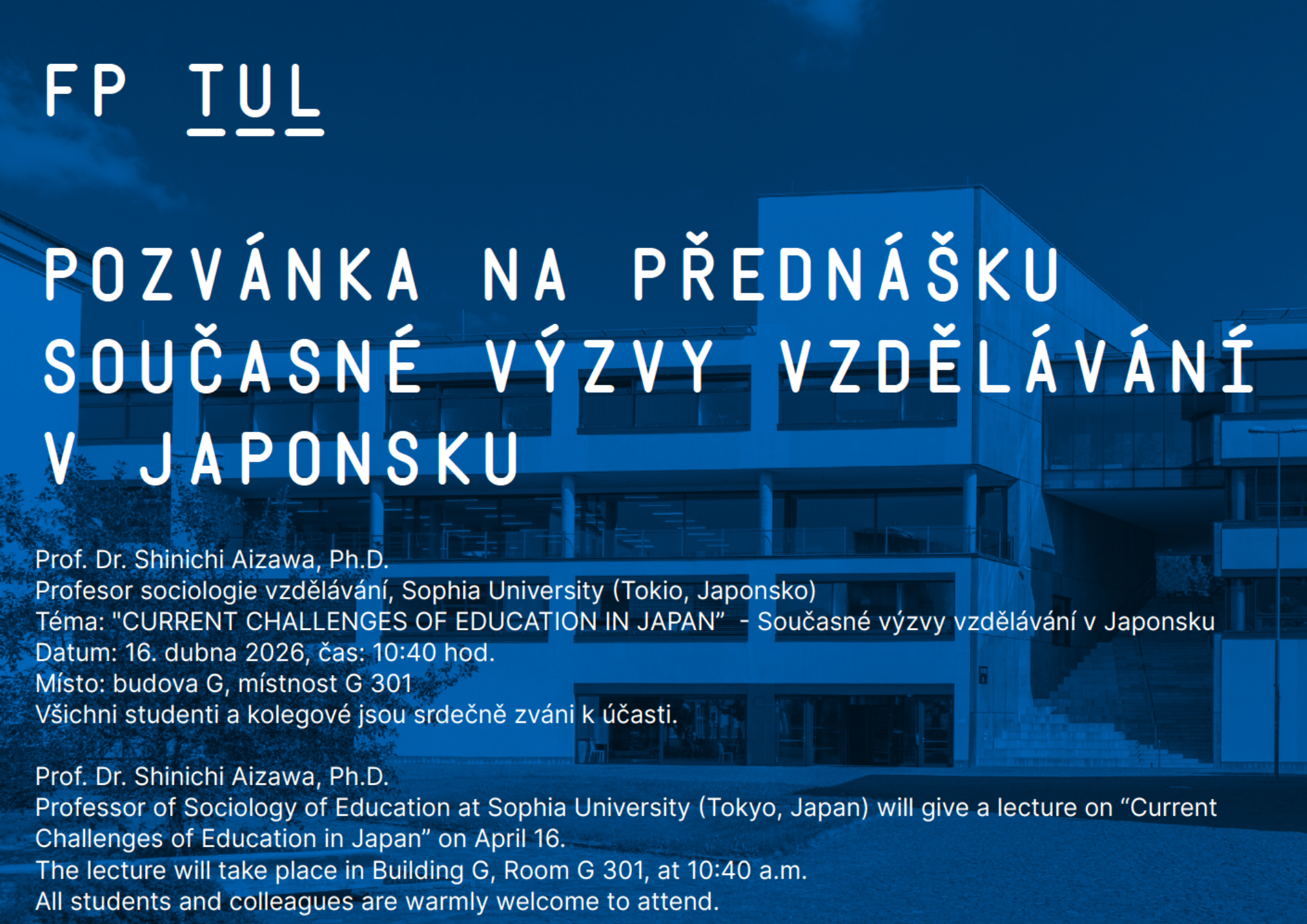 Katedra pedagogiky a psychologie (KPP) zve všechny zájemce na přednášku profesora Shinichi Aizawa Současné výzvy vzdělávání v Japonsku / Current challenges of education in Japan, která se uskuteční ve čtvrtek 16. dubna 2026 od 10:40 na budově G (G301).