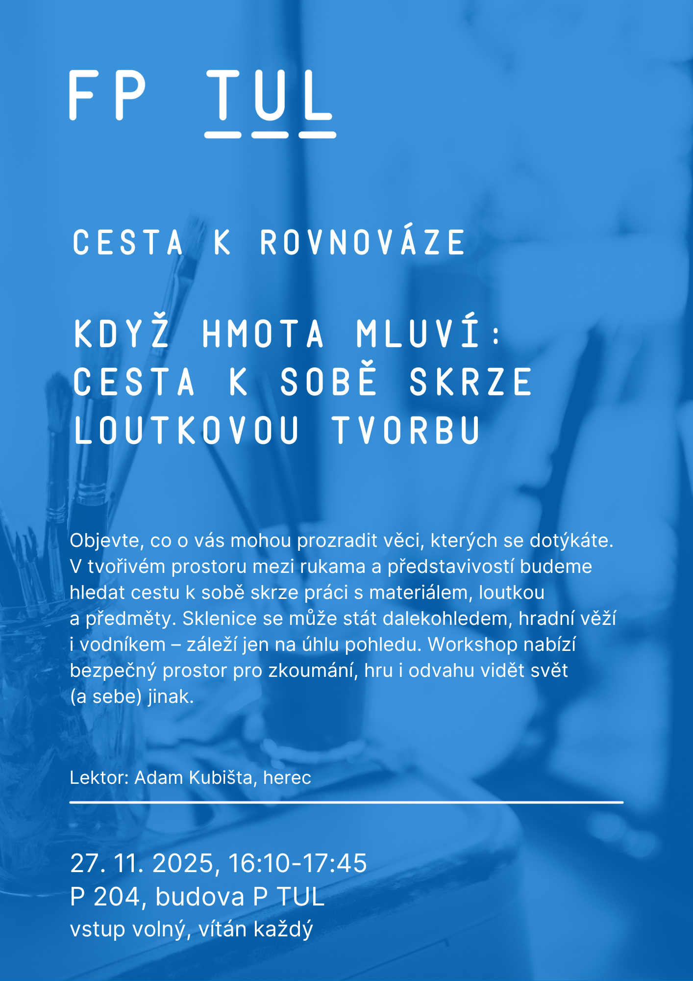 Katedra primární a preprimární pedagogiky (KPV) zve všechny studující i vyučující na cyklus workshopů a diskuzí Cesta k rovnováze. Skrze kreativní metody, práci s tělem a otevřený dialog objevíte, jak pečovat o svou mysl, tělo a tvůrčího ducha. Osvojíte si dovednosti, které vám usnadní zvládat stres, předcházet vyhoření a budou inspirací pro vaše (budoucí) povolání.