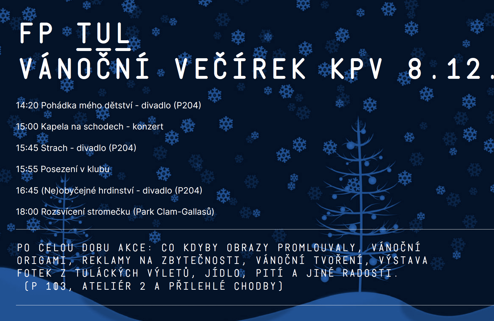 Katedra primární a preprimární pedagogiky (KPV) všechny studující a vyučující FP TUL srdečně zve na vánoční odpoledne a večírek, který se uskuteční v pondělí 8. prosince od 14 do 18 hodin v budově P. Můžete se těšit na krátká studentská představení, ukázky z filmové tvorby, vystoupení školní kapely, na možnost vyrobit si vlastní origami i na malé ohlédnutí za našimi tuláckými výlety. Program vrcholí rozvícením stromečku v parku Clam-Gallasů a zpěvem koled. Chybět nebude ani něco dobrého k jídlu a pití.