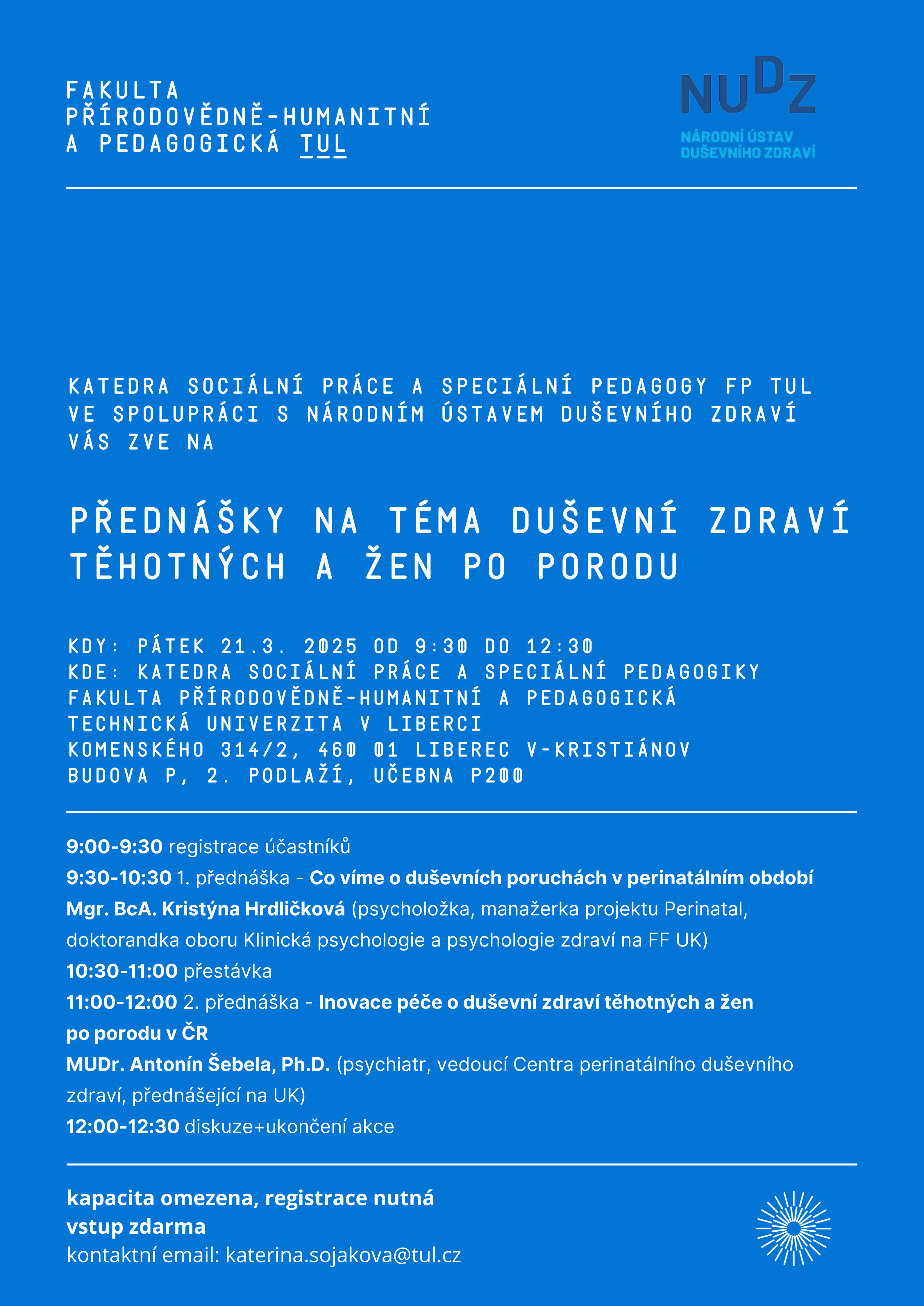 - 21. 3. 2025 Duševní zdraví těhotných a žen po porodu (od 9:00 do 12:30, budova P, učebna P200, přednáší Mgr. BcA. Kristýna Hrdličková a MUDr. Antonín Šebela, Ph.D.)