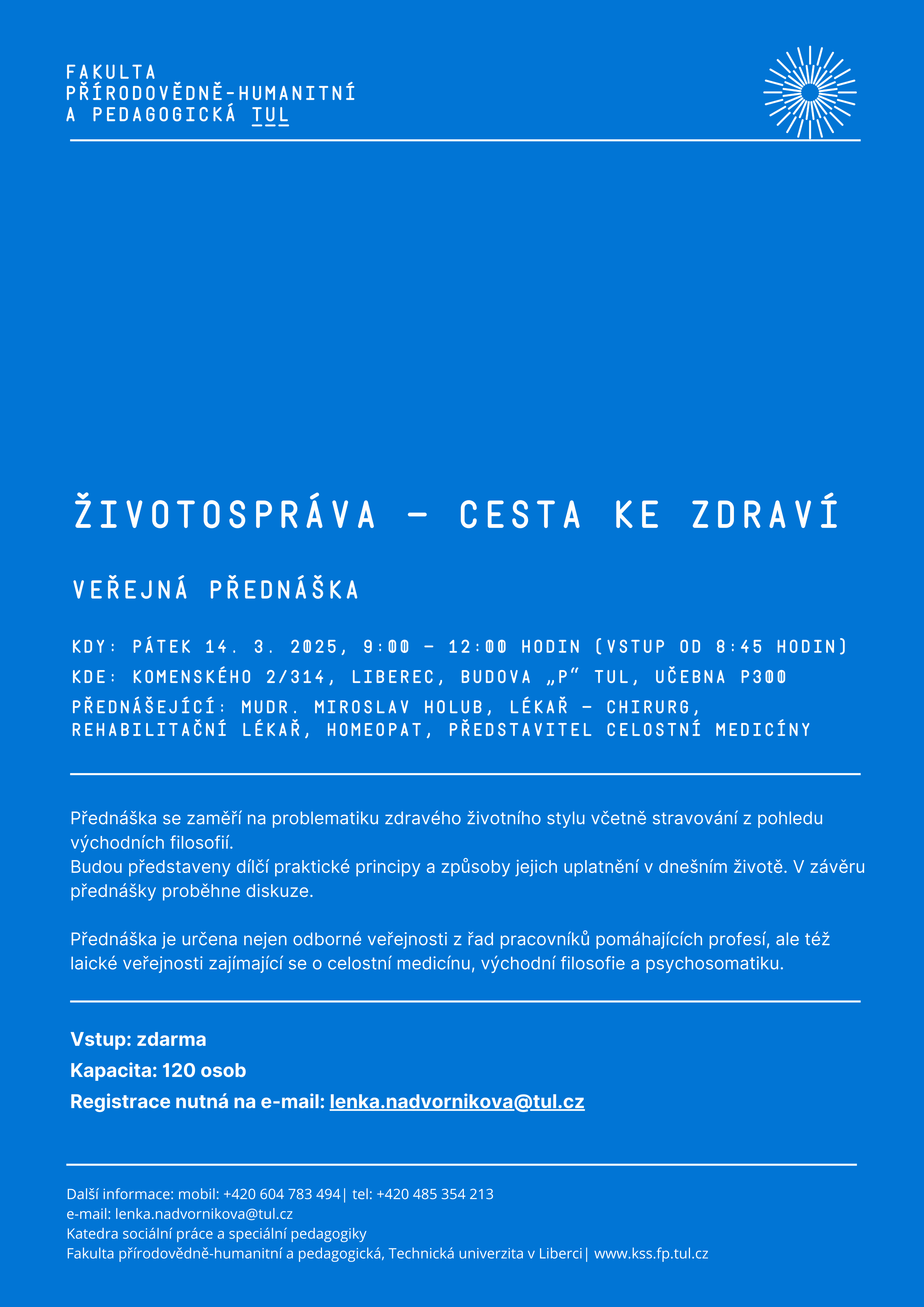 - 14. 3. 2025 Životospráva – cesta ke zdraví (od 9:00 do 12:00, budova P, učebna P300, přednáší MUDr. Miroslav Holub)
