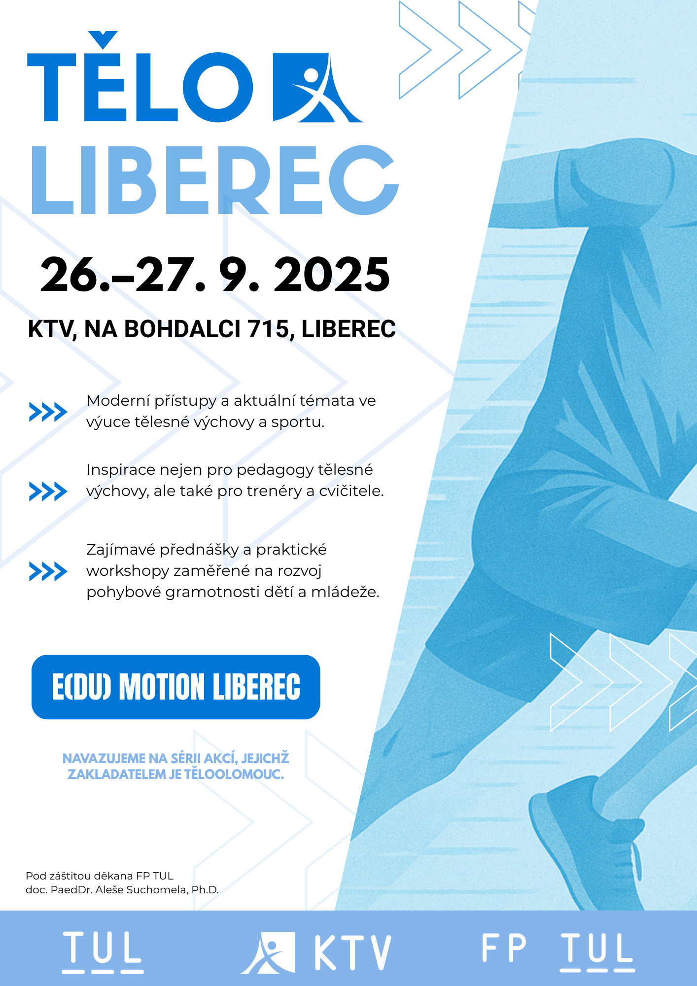 Katedra tělesné výchovy a sportu ve dnech 26. a 27. září 2025 pořádá první ročník konference TěloLiberec, který přinese řadu inspirativních praktických seminářů i několik teoretických přednášek zaměřených na výuku tělesné výchovy na školách všech stupňů, mimoškolní pohybové výchově a trenérské, cvičitelské a instruktorské praxi.