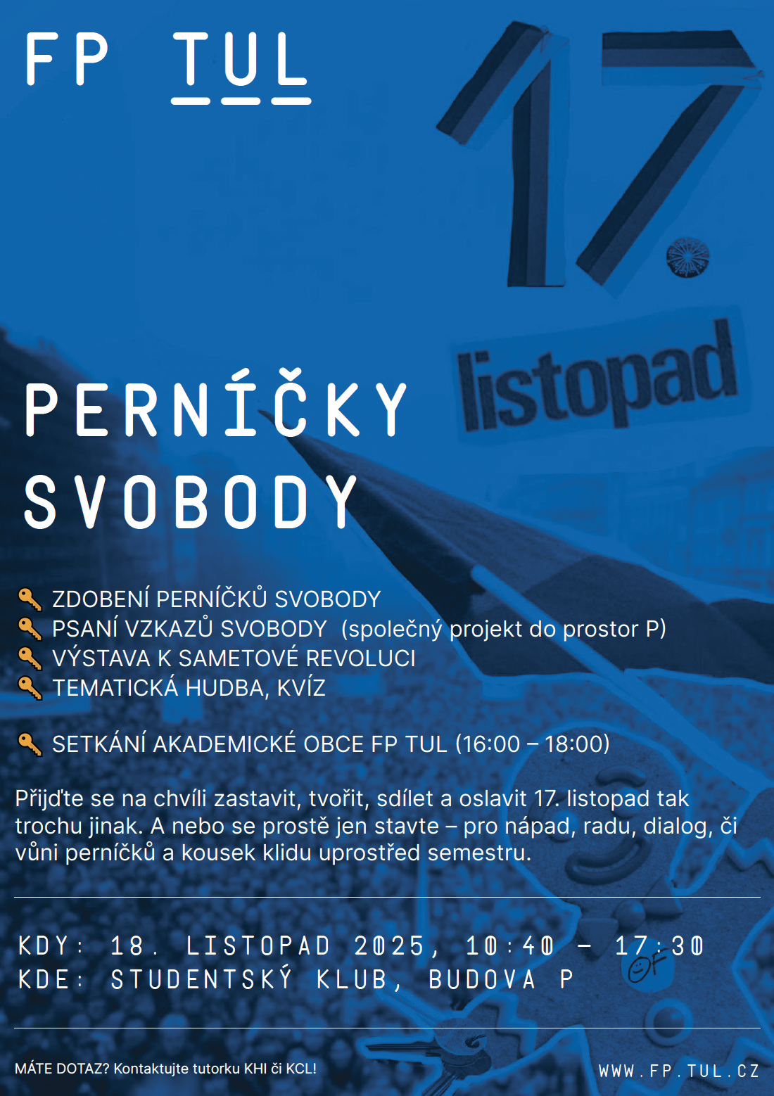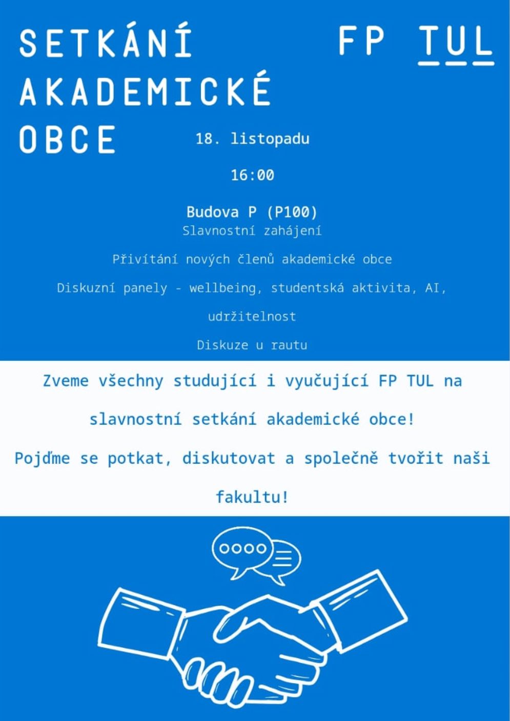 zveme vás na Slavnostní setkání akademické obce FP TUL, které se uskuteční 18. listopadu 2025 v 16 hodin v posluchárně P100 (budova P). Na akci společně přivítáme nové členy akademické obce a v následné diskuzi, v níž uvítáme vaše názory a podněty, se zaměříme na témata wellbeingu, studentské aktivity, AI a udržitelnosti.