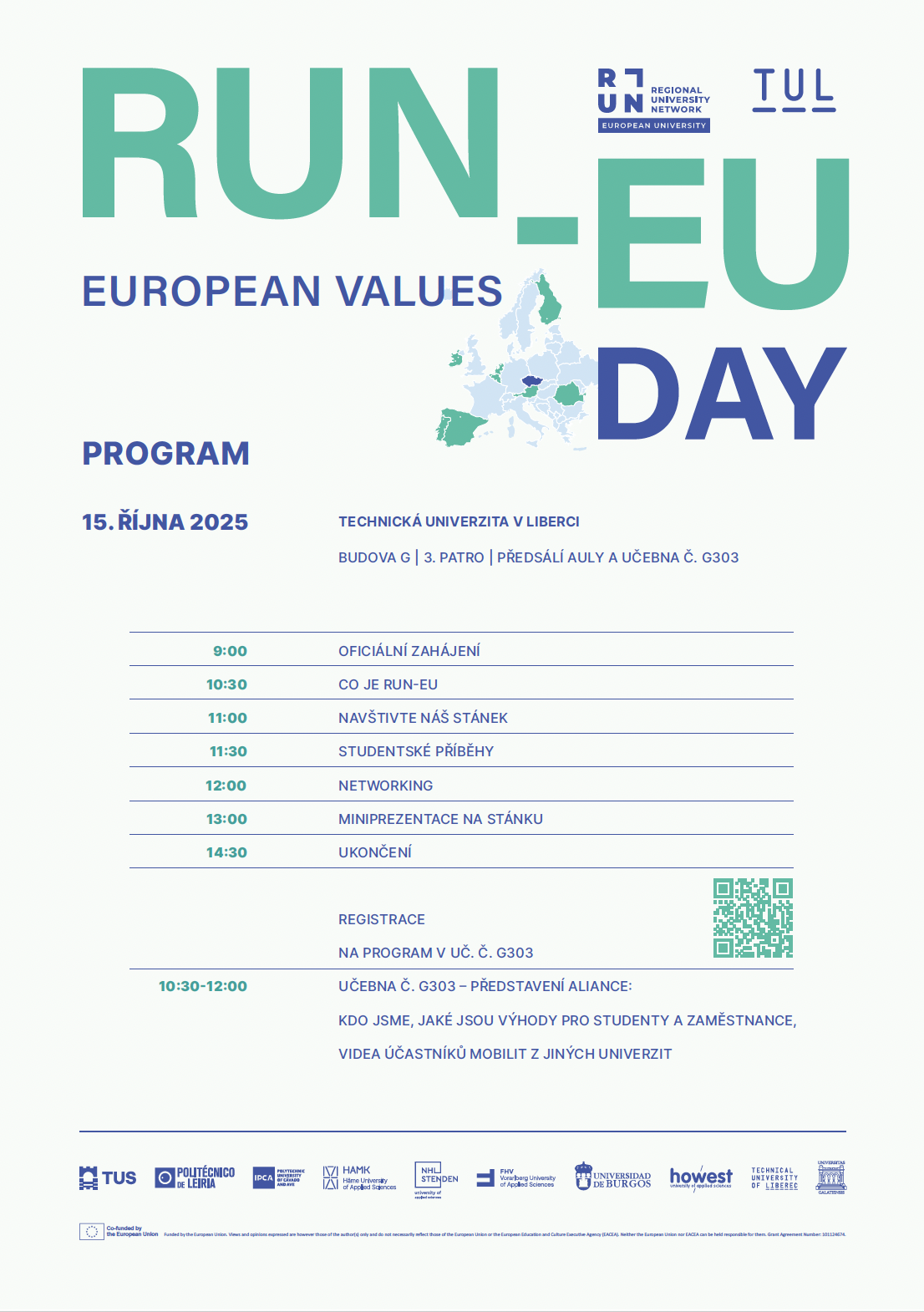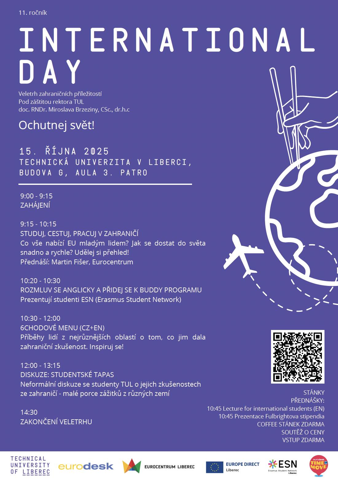 Ve středu 15. října 2025 od 9:00 do 14:30 se v aule TUL (3. patro budovy G) koná už tradiční International Day, veletrh zahraničních příležitostí pro studující i zaměstnance naší univerzity. Spolu s ním se ve stejném čase a na stejném místě letos poprvé uskuteční také RUN EU Day.