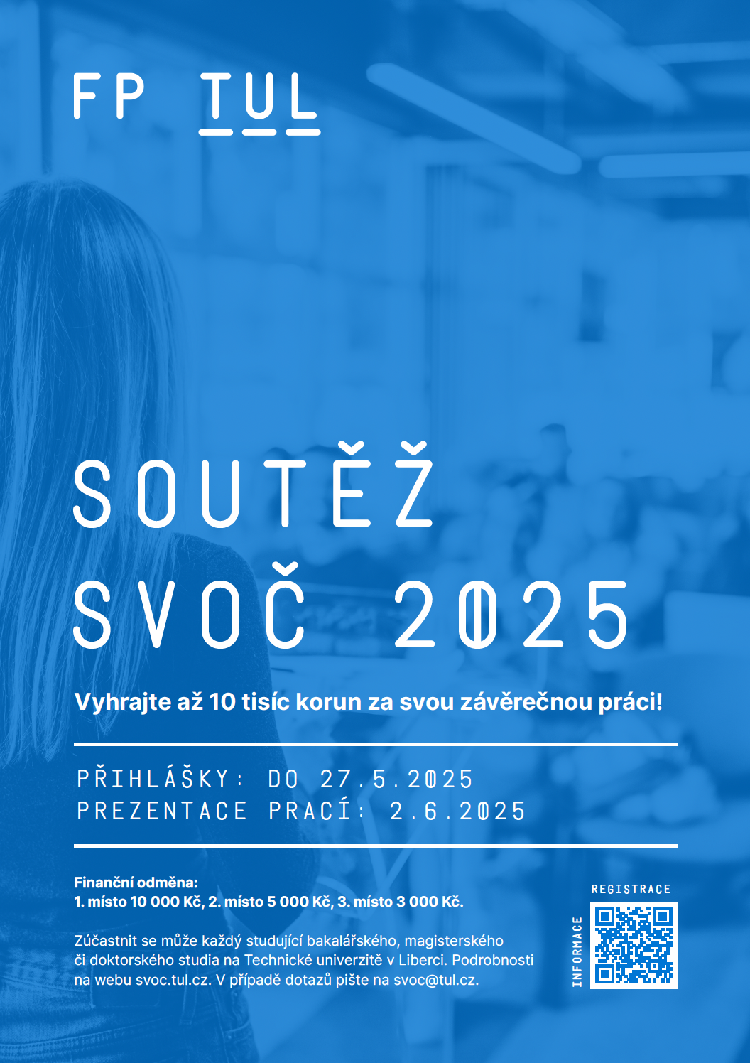 Vroce 2025 se tradiční soutěž ve Studentské vědecké a odborné činnosti (SVOČ) uskuteční již po sedmnácté a je vyhlášena pod záštitou Fakulty textilní, Fakulty strojní, Fakulty mechatroniky, informatiky a mezioborových studií, Ekonomické fakulty a Fakulty přírodovědně-humanitní a pedagogické Technické univerzity v Liberci.