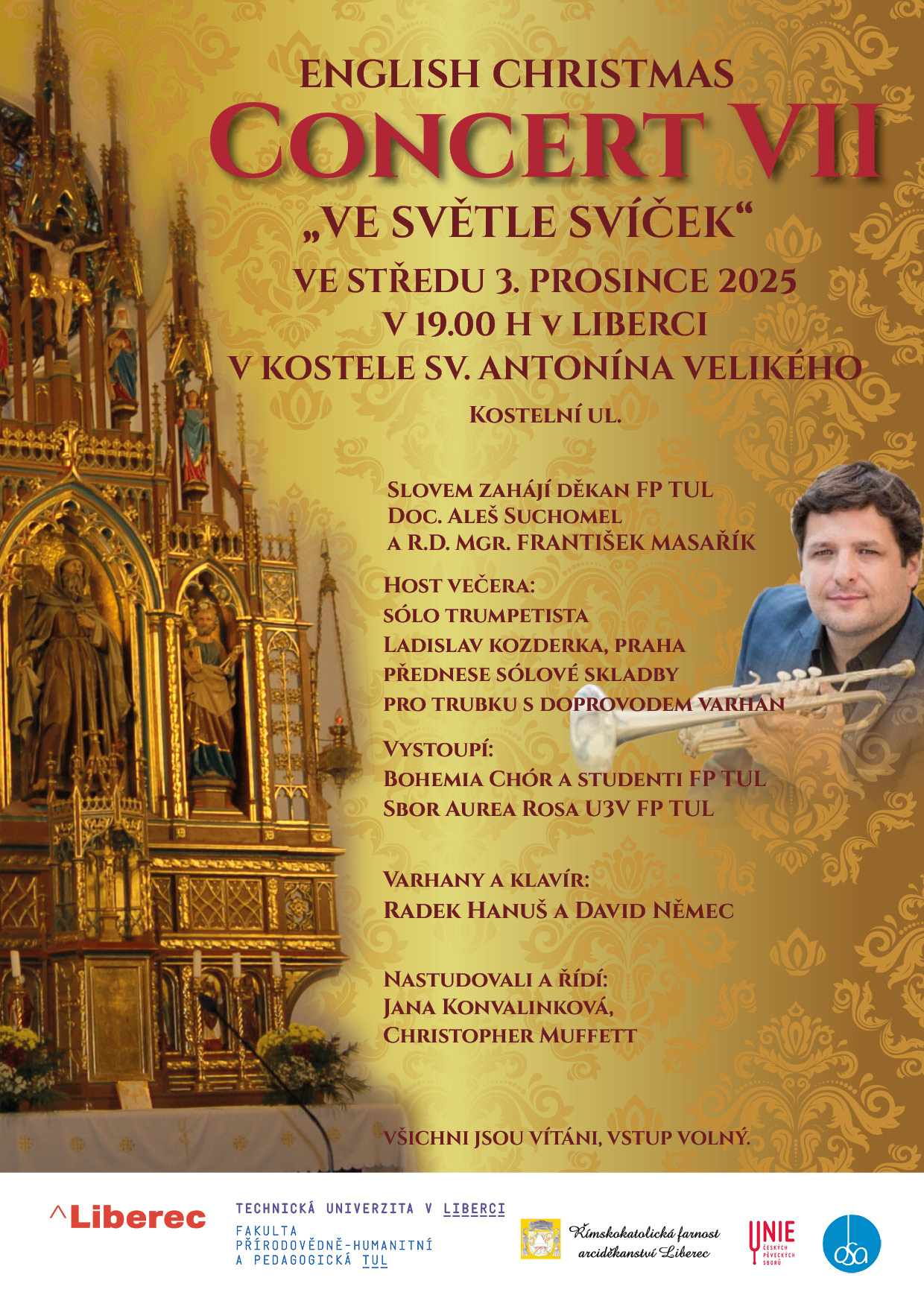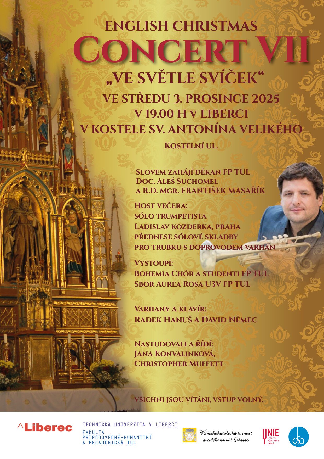 Ve středu 3. prosince 2025 v 19 hodin v kostele sv. Antonína Velikého v Liberci zazní již po sedmé unikátní projekt English Christmas Concert VII - Ve světle svíček. Vystoupí sbory Bohemia Chór a Aurea Rosa pod vedením Jany Konvalinkové (KPV) a Christophera Muffetta (KAJ). Slovem zahájí děkan FP TUL Aleš Suchomel.