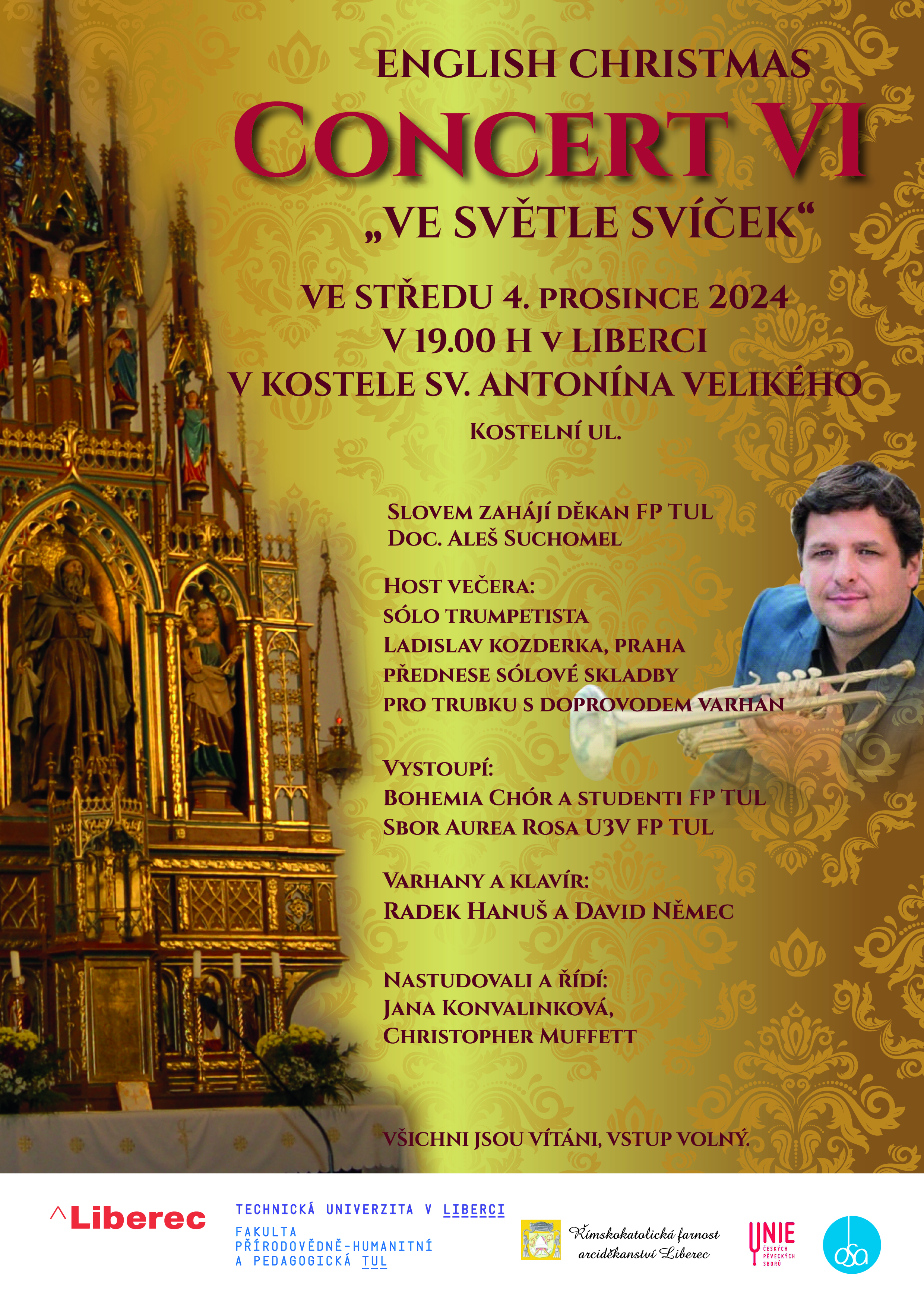 Vystoupí Bohemia Chór FP TUL a sbor Aurea Rosa U3V FP TUL, na varhany a klavír zahrají Radek Hanuš a David Němec. A jako každý rok, i letos byl přizván vzácný host – tentokrát sólo trumpetista Ladislav Kozderka.