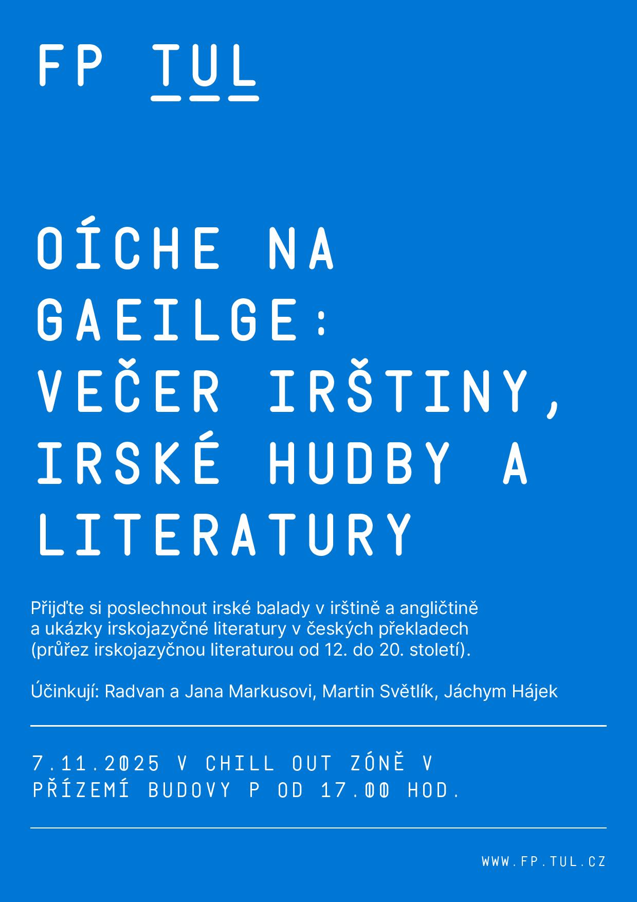 Katedra anglického jazyka (KAJ) zve všechny studující, vyučující i zájemce mimo FP TUL na Oíche na Gaeilge: Večer irštiny, irské hudby a literatury, který se uskuteční v pátek 7. listopadu 2025 od 17 hodin (Chill out zóna, přízemí budovy P).