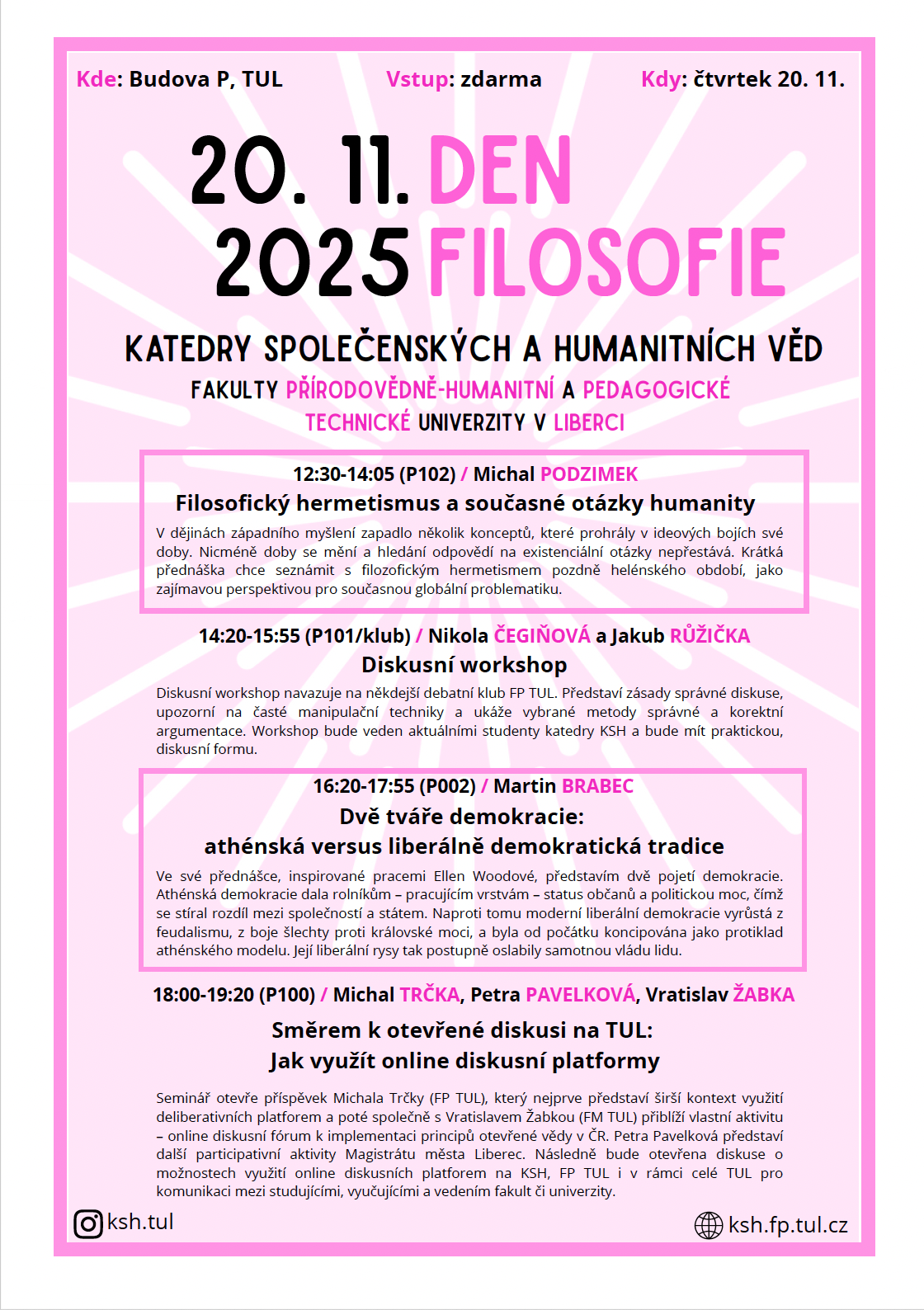 Katedra společenských a humanitních věd (KSH) zve všechny zájemce na přednášky a semináře, které se uskuteční 20. listopadu 2025 od 12:30 jako součást akce Den filosofie (budova P, ul. Komenského).