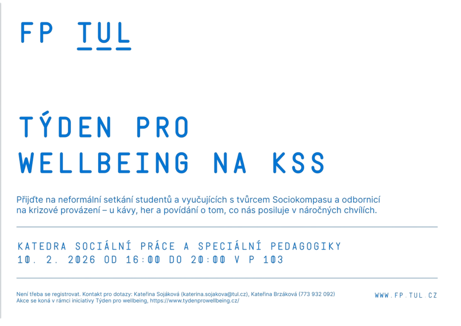 Katedra sociální práce a speciální pedagogiky (KSS) zve všechny studující a vyučující FP TUL na neformální setkání s tvůrcem Sociokompasu a odbornicí na krizové provázení, které se uskuteční v úterý 10. února 2026 od 16:00 do 20:00 (P 103) u příležitosti Týdne pro wellbeing.