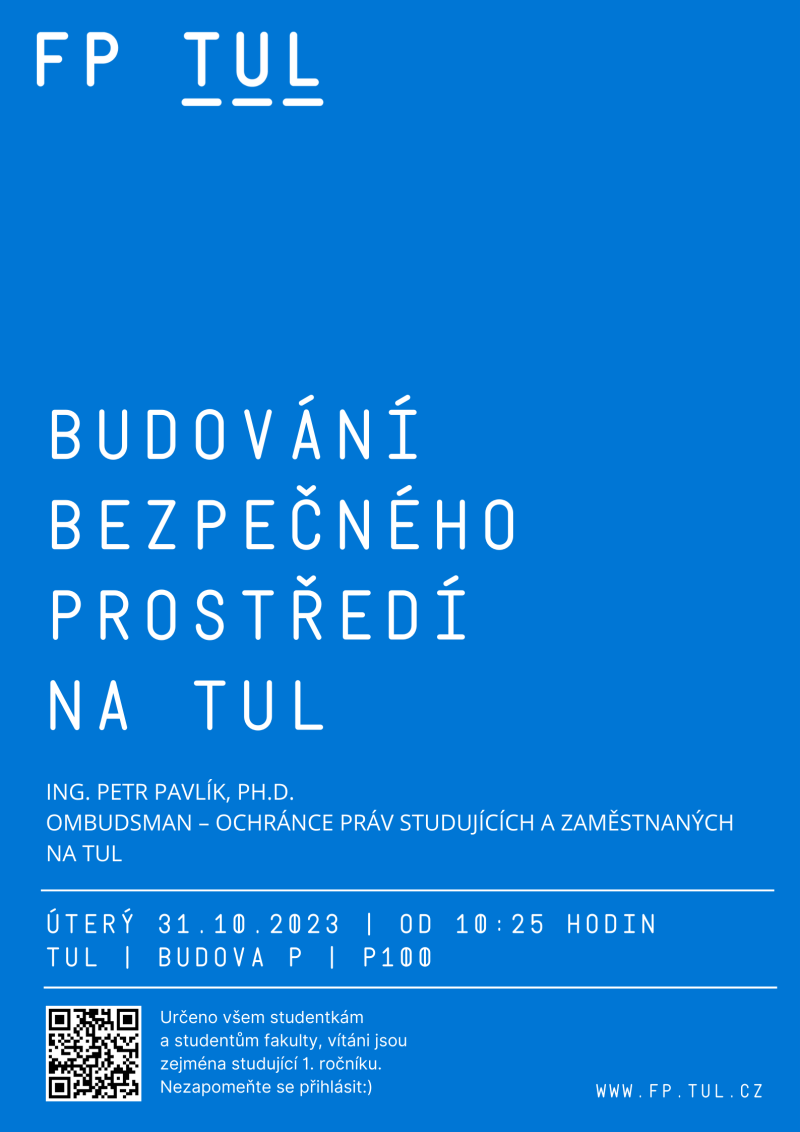 Přednáška univerzitního ombudsmana Ing. Petra Pavlíka, Ph.D. přiblíží studentům, proč a jak je třeba se věnovat prevenci a řešení šikany, sexuálního obtěžování, bossingu a podobných nežádoucích jevů. Dotazy do diskuze je možné poslat na e-mail: This email address is being protected from spambots. You need JavaScript enabled to view it.. Akce je cílena hlavně na studenty prvních ročníků, ale zváni jsou samozřejmě všichni studenti i vyučující. Předběžné přihlášení je možné pomocí qr kódu.